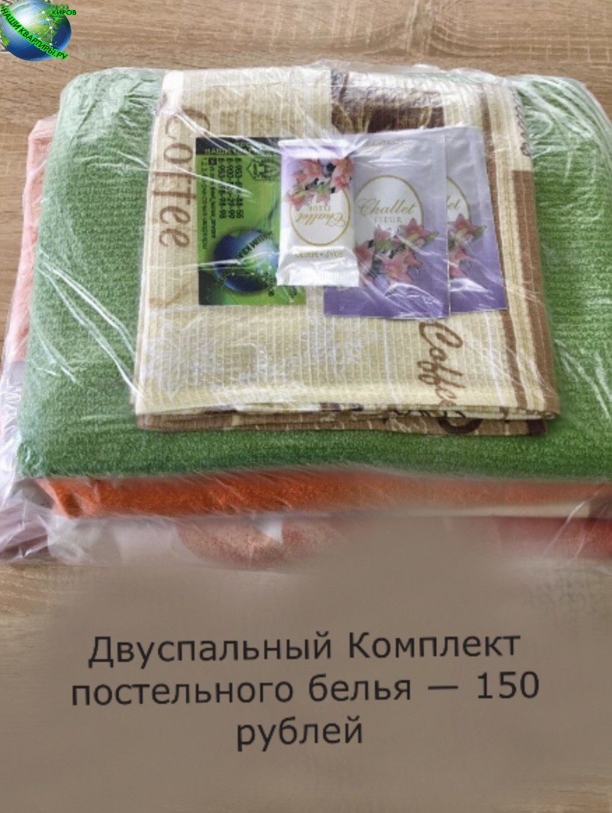 7. Кроме постельного белья всё включено в стоимость проживания!!! Постельное бельё в стоимость не входит. РАЗОВАЯ ПЛАТА 150 рублей один двуспальный комплект. В комплект постельного входит: 2 наволочки, двуспальный пододеяльник, двуспальная простынь, 2 банных полотенца, одно кухонное, одноразовые мыло, шампунь и гель для душа